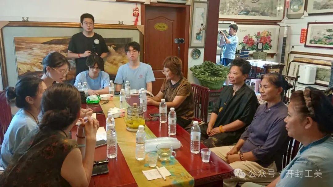 同学们与河南省工艺美术大师,“汴绣”传承人吴凤娟和刘瑞红、魏然、何丽霞、刘静等进行认真的交谈。从汴绣起源、文化价值及传承现状,汴绣的历史传承、制作工艺及市场前景,并参观了汴州绣庄的经典汴绣作品,探索非遗与现代市场的结合路径。